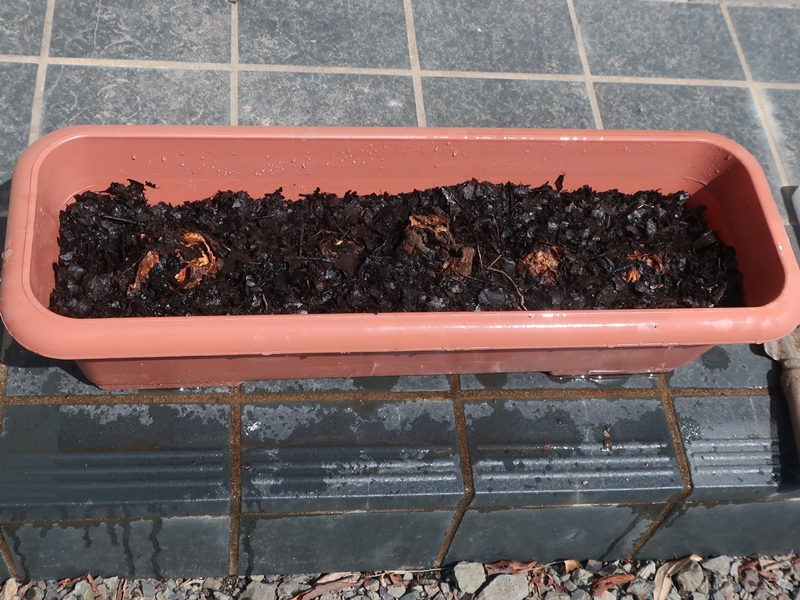 まずはプランターに腐葉土を入れ、湿らせたうえでこの中に埋めて芽が出るのを待ちます。