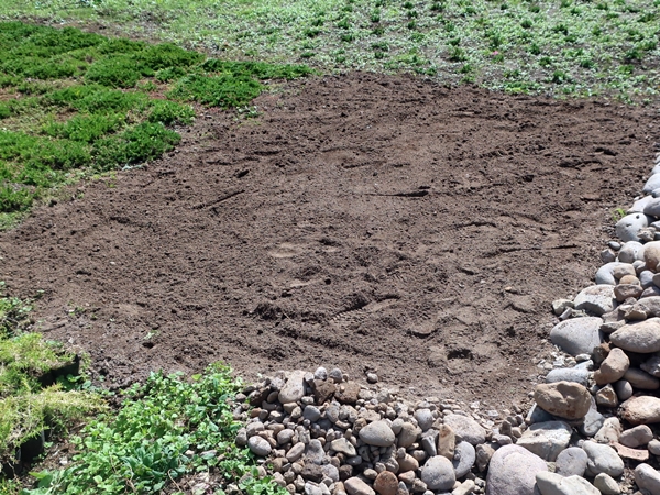 そこで、土を掘り起こして粘土層をほぐすとともに石を取り除くことしました。これがかなりの難作業で、これだけの面積を掘り起こすのに1週間かかりました。