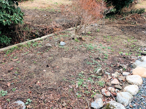 その前に本日手掛けたのがこちら、昨年12月に植え替えしたドウダンツツジの根元へのグランドカバーです。