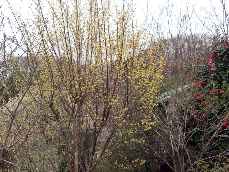 庭には山茱萸(サンシュユ)の小さな黄色の花が咲いています。