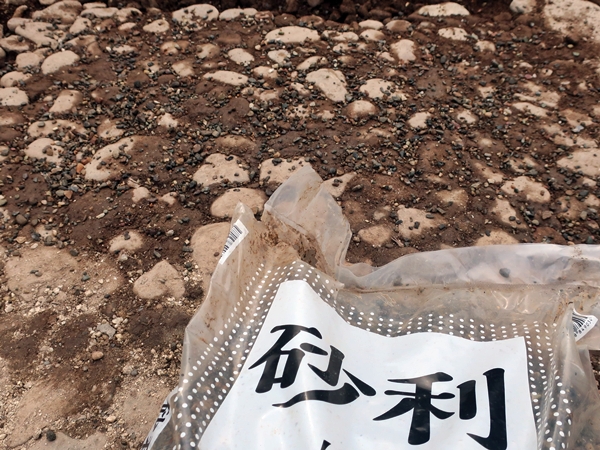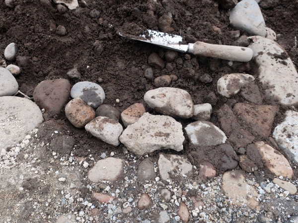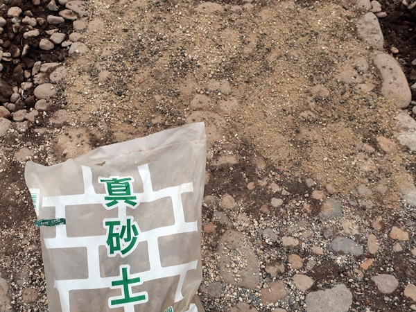 そして石を安定させデコボコをならすために、小粒の砂利と砂をまんべんなくまきます。