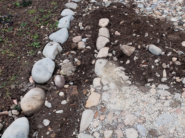 道の端は大きめな石を並べて、中の石がずれないよう固定します。