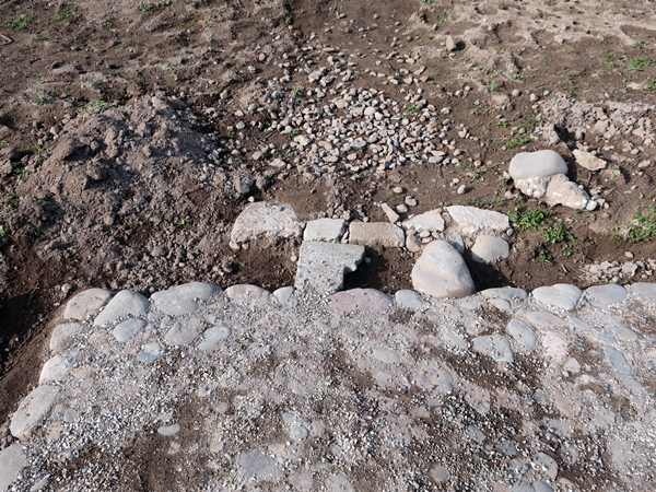 左側の石列は庭の縁石。二列の間は溝にする予定です。