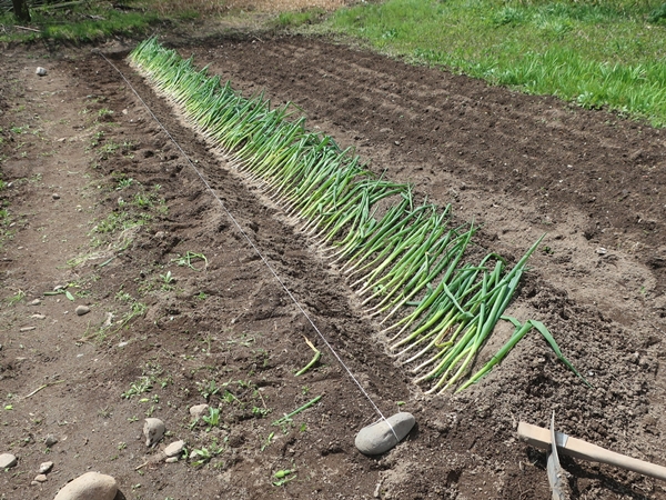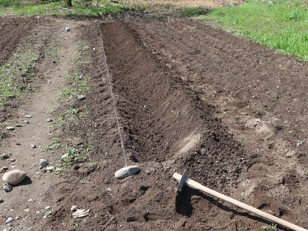 溝を深く掘り、土を斜めに寄せて、そこに苗を並べていきます。