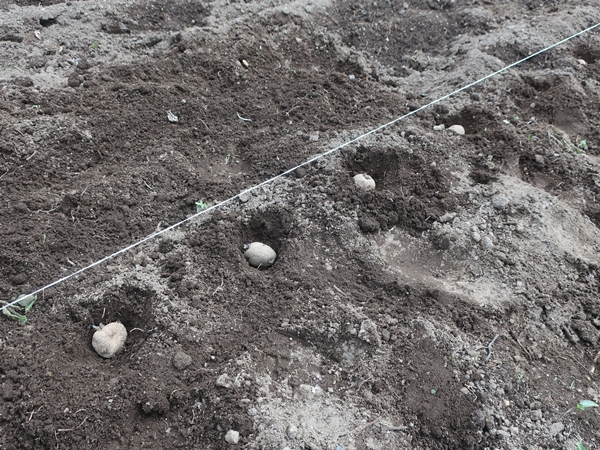 30cm間隔で、深さ8cmの穴を掘り、そこに種イモを植えていきます。