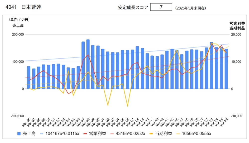 4041 日本曹達 2024-08-17 最終更新日時 : 2025-09-09 塗(みち)の人 ※同社につきましては直近のモニタリング対象外のため、長期業績グラフ・安定成長スコアのみ更新して掲載します。 長期業績グラフ・安定成長スコア ※長期業績グラフおよび安定成長スコアの詳しい説明はコチラ ※当記事は投資の推奨を目的としたものではありません。投資判断は自己責任でお願いします。※データの一部は手作成・手入力のため、誤りがある可能性についてお含みおきください。 資産運用帳 目次へ \ 最新情報をチェック / FacebookXBlueskyHatenaCopy